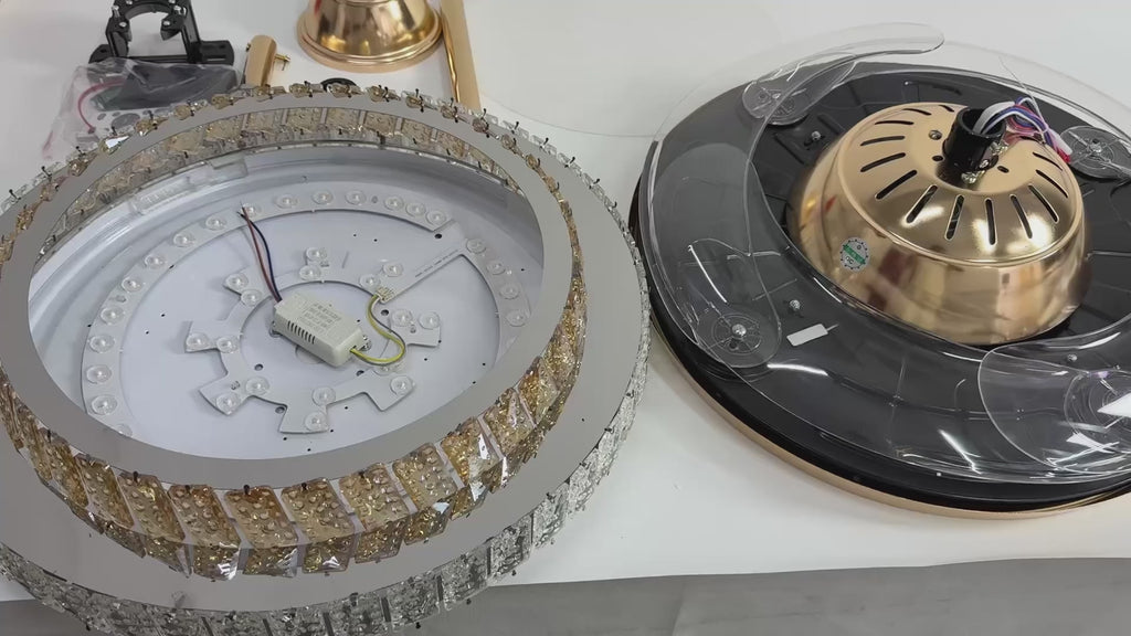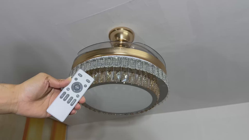 The Windora Aurea 42" Gold Dual-Tone Crystal Ceiling Fan combines luxury and performance in a single refined design. Featuring a radiant gold finish and a shimmering dual-tone crystal band, it brings chandelier-like sophistication to any space. Retractable blades remain concealed when not in use, preserving its flawless, decorative silhouette.